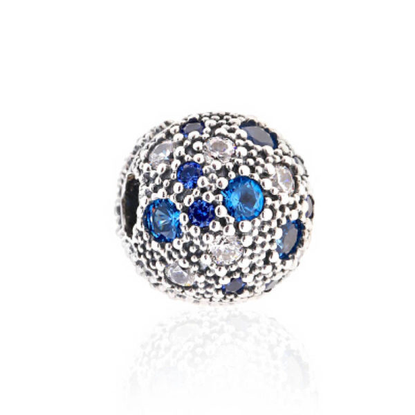 Como una galaxia en miniatura, este diseño de inspiración celestial está esculpido en forma de bola, hecho de plata esterlina. Decenas de cristales azules y zirconia cúbica transparente en diferentes tamaños crean un contraste brillante con el fondo de cuentas. Úselo en una pulsera Pandora Moments para crear estilos equilibrados o enróllelo en una cadena de collar favorita para una apariencia celestial.