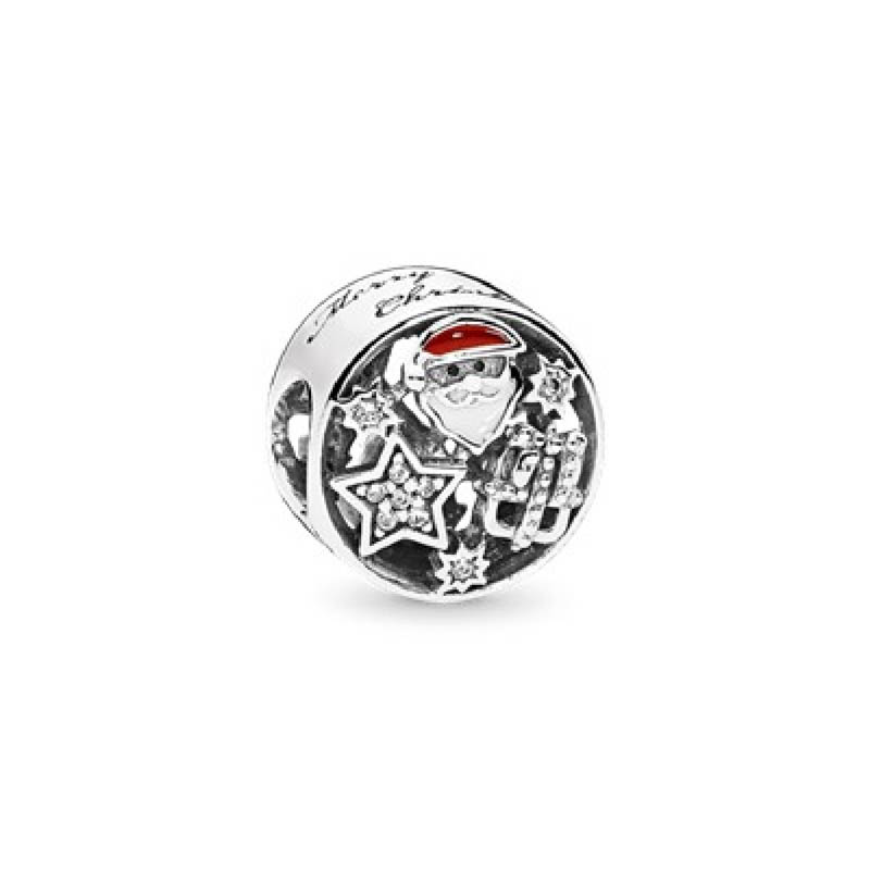 Siéntete festivo cuando lo desees con esta escena colorida y brillante. Este dije de plata esterlina y esmalte presenta a Papá Noel, estrellas y regalos.