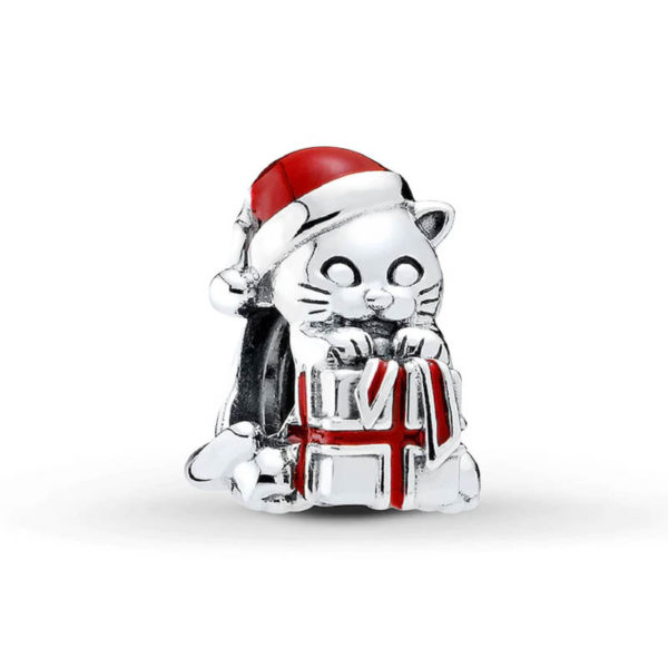 Este adorable dije de gatito está elaborado en plata salpicada con cintas de esmalte rojo y sombrero.