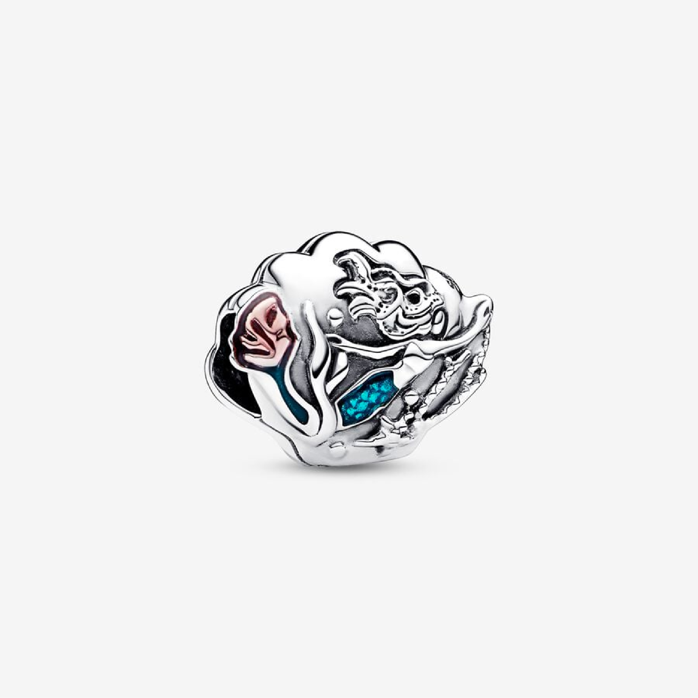 Descubre tesoros incalculables con nuestro dije de concha de La Sirenita de Disney. Esta pieza de plata esterlina representa una maravillosa escena submarina completa con peces de colores y Ariel nadando, cada uno terminado con detalles de esmalte aplicados a mano. Las cuentas de plata de ley representan burbujas del océano y añaden un toque caprichoso al arrecife de coral engastado con piedras rosas. “Bajo el mar” está grabado sobre el paisaje marino, recordándonos que hay belleza y magia más allá de la costa. Tenga en cuenta que este amuleto de concha está cerrado y no se abre. Deslízalo sobre tu porta amuletos favorito.