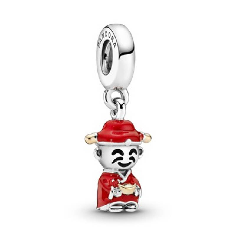 Colgante del dios de la riqueza en plata de ley con detalles de oro de 14k, esmalte rojo y negro
