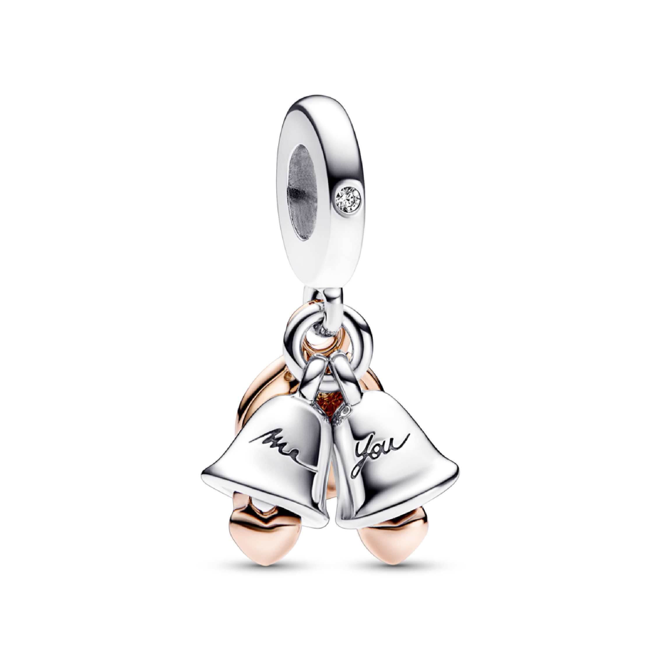 ¡Que suenen las campanas para la feliz pareja! El Charm Colgante Doble Campanas de Boda de dos tonos es una celebración de un nuevo hito en su historia de amor. Cuenta con dos campanas de boda colgantes en plata de ley, cada una con un pequeño corazón chapado en oro rosa de 14k en su interior: una campana está grabada con “Tú” y la otra con “Yo”. Un disco chapado en oro rosa de 14k grabado con el mensaje “Recién casados” completa el dije. Úselo en su pulsera o porta amuletos favorito como recuerdo de su día especial y como celebración de todos los nuevos recuerdos que crearán juntos.