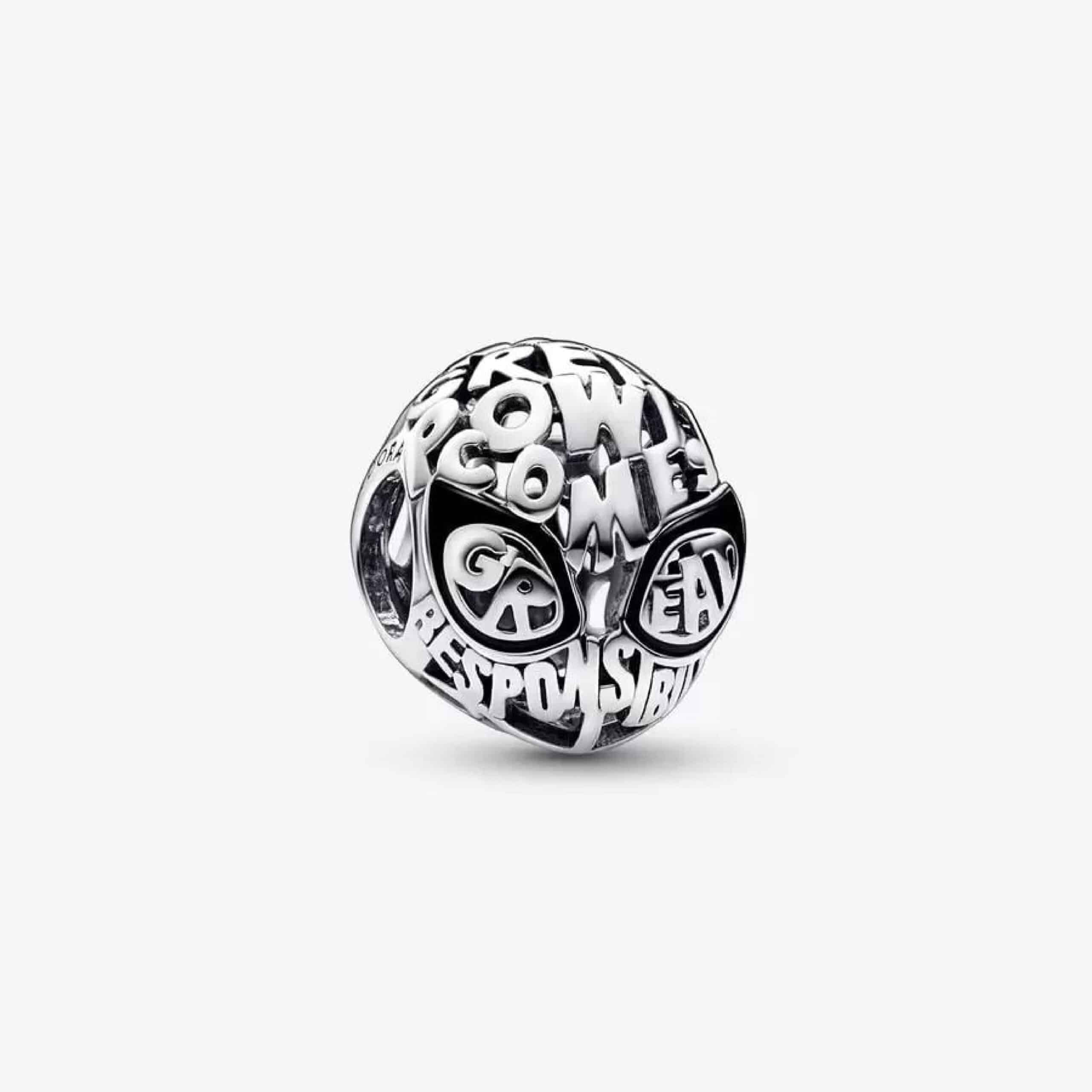 Haz girar tu propia historia de Spider-Man con nuestro amuleto de máscara de Spider-Man de Marvel. Elaborado en plata esterlina con la forma de la máscara de Spider-Man, el frente del amuleto está compuesto por una fuente gráfica que detalla el icónico recordatorio “Un gran poder conlleva una gran responsabilidad”. La parte posterior del amuleto presenta detalles de tela calada, mientras que el frente incluye contornos de ojos de esmalte negro. Dale estilo a este peculiar amuleto en tus pulseras, aretes o portadijes como un recordatorio de que eres increíble tal como eres.