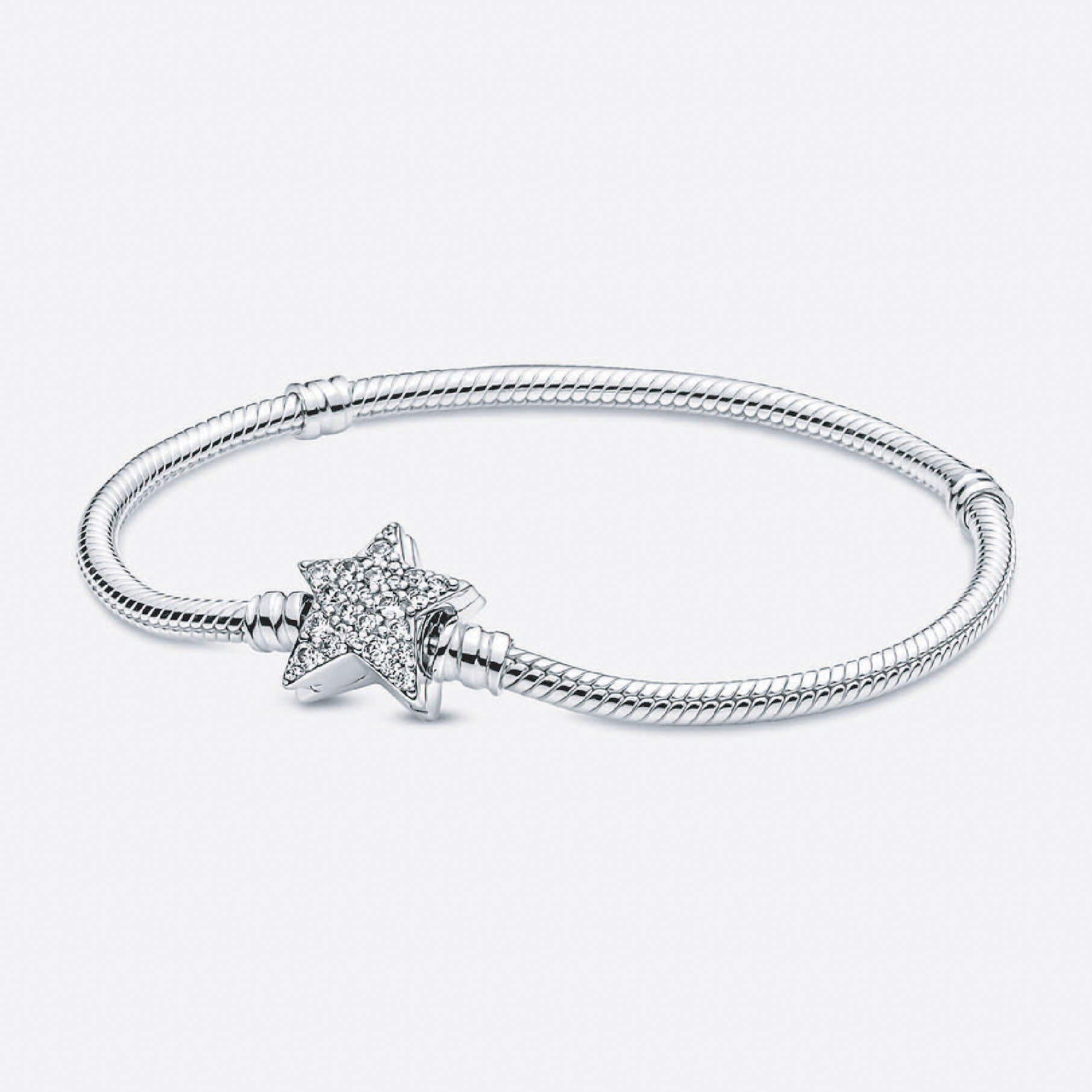 Aporta un brillo celestial a tu look con la pulsera asimétrica de cadena de serpiente con cierre de estrella de Pandora Moments. Acabado a mano en plata de ley, el cierre en forma de estrella de la pulsera está cubierto por un brillante pavé de circonitas cúbicas transparentes en ambos lados. Se puede usar con hasta 16-18 amuletos y clips deseados. Úselo solo para una apariencia simple y discreta, o combínelo con otros diseños de inspiración celestial para una apariencia fuera de este mundo.