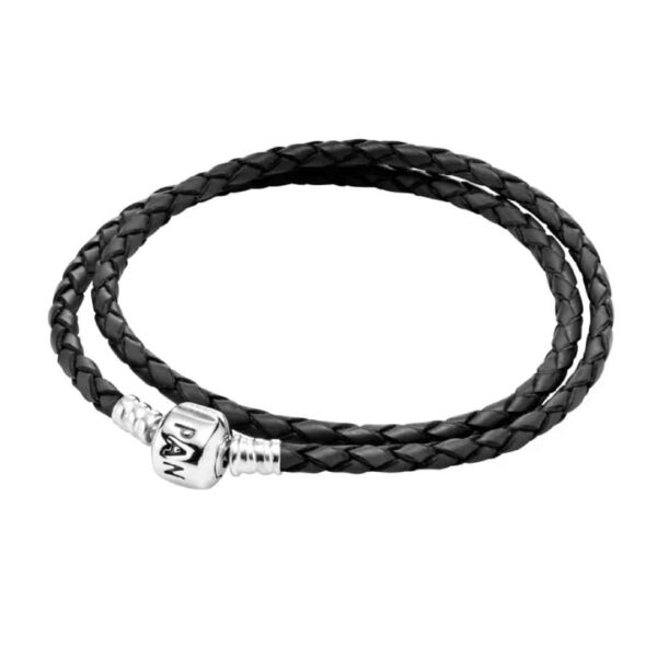 Esta pulsera de cuero trenzado de doble capa negra con cierre redondo de plata de ley es imprescindible para agregar a su colección. ¡Agrega algunos encantos para que sea tuyo!