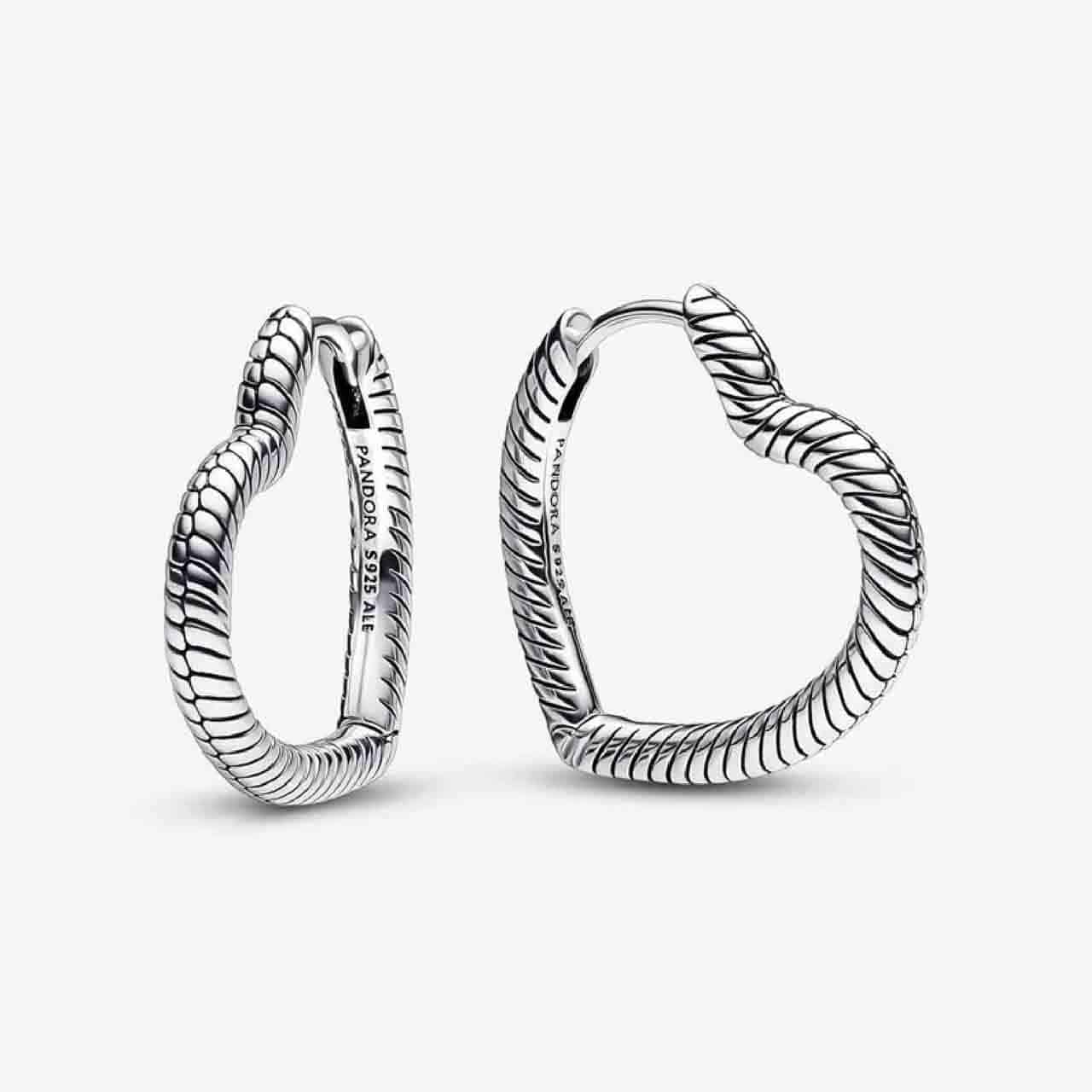 Pendientes que te enamorarán. Elaborados en plata esterlina con el icónico patrón de cadena de serpiente de Pandora, estos aros asimétricos son un recordatorio de que el amor verdadero nunca es uniforme. Use estos símbolos de amor propio por sí solos, o diseñe hasta tres de sus amuletos, colgantes y colgantes y cuéntele al mundo su historia.