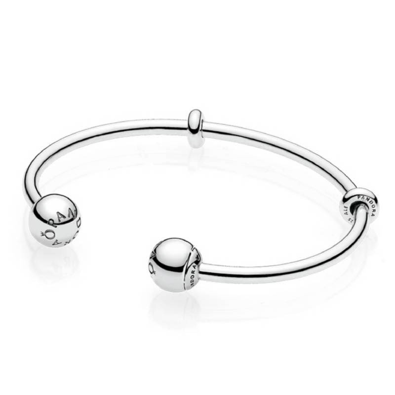 La clásica pulsera con dijes se reinventa con este impresionante brazalete abierto de Pandora: moderno, sofisticado y más fácil de llevar que nunca. Elaborado en plata de ley, este estilo elegante cuenta con tapas en los extremos en relieve para asegurar sus tesoros en su lugar. Use este brazalete de Pandora solo, adornado con sus amuletos favoritos o en capas con otros brazaletes como una declaración audaz.