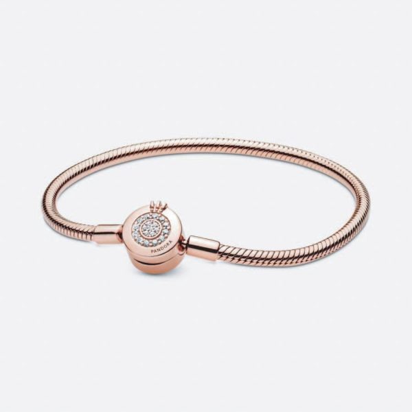Da un toque de brillos a cualquier de tus atuendos con el Brazalete Diseño Cadena de Serpiente O Coronada Brillante de Pandora Moments. Acabada a mano con un recubrimiento de oro rosa de 14 K, el broche de la pulsera presenta el icónico monograma de la Corona Pandora O y brillantes circonitas cúbicas en pavé engarzadas a nivel, mientras que la cadena diseño cadena de serpiente aportará un toque elegante y moderno a tu muñeca. Combínala con otras pulseras y embellécela con tus charms favoritos y te la pondrás una y otra vez.