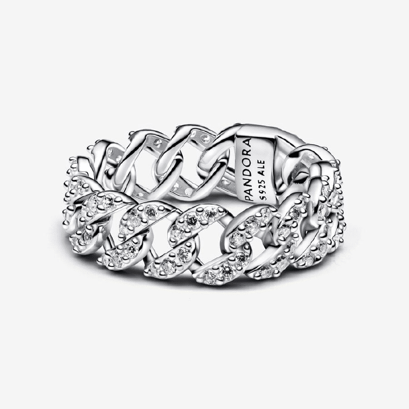 Este anillo de cadena cubana con pavé en plata de ley redefine la elegancia con 84 circonitas cúbicas transparentes de talla brillante engastadas en cuentas. Con un sofisticado motivo de cadena, luce un pavé de tres piedras en cada eslabón semicircular, que le otorga un brillo impactante. Su parte trasera pulida garantiza comodidad, mientras que el logotipo plano le da un toque de refinamiento. Combínalo con tu atuendo de noche favorito o con un traje elegante para un look refinado y sofisticado.