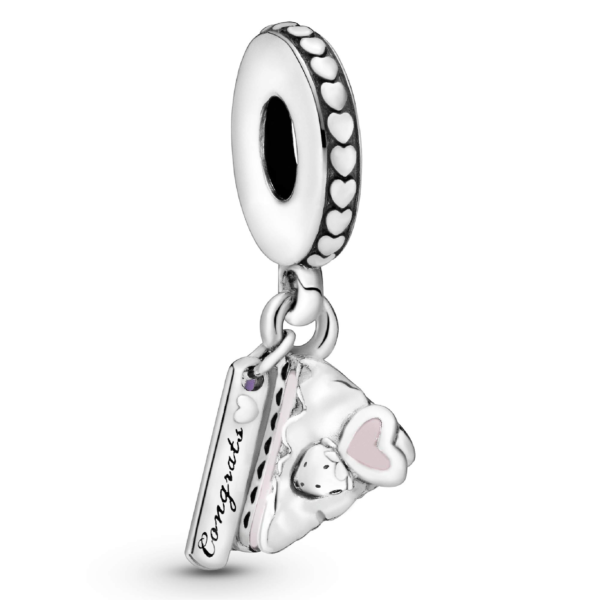 Charm colgante PANDORA Tarta de Celebración en plata de primera ley, adornado con esmalte rosa, morado y plateado y grabado “Congrats”. “Felicidades”.