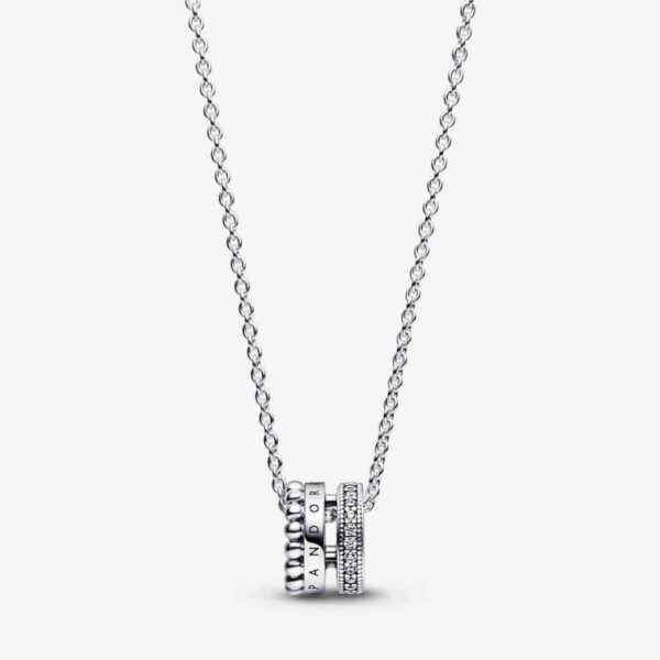 Expresa tu estilo característico con el colgante y collar Pandora Signature Logo Pavé & Beads acabado a mano. El colgante de tres bandas presenta una silueta geométrica llamativa que combina los elementos de diseño icónicos de la colección en perfecta armonía. El logotipo de Pandora está inscrito en una de las bandas, mientras que las otras están decoradas con pavé de circonitas cúbicas y microcuentas. Los tres anillos de salto le permiten ajustar el collar para que se adapte a su escote, lo que lo convierte en el complemento perfecto para cualquier atuendo.