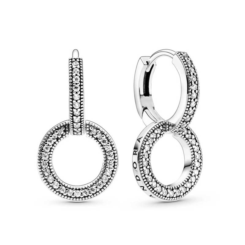 Dos es mejor que uno con los brillantes pendientes de aro doble. Con un acabado a mano en plata de ley, estos aros tienen dos círculos enlazados del mismo tamaño con filas de pavé de circonita cúbica transparente engastada con cuentas. Los corazones con micro cuentas en relieve y el logotipo de Pandora agregan detalles aún más intrincados a estos aretes de aro colgantes, que se balancean desde la mitad inferior, lo que les da un movimiento encantador. Póntelos para salir por la noche o para añadir un toque refinado a tu look diurno.
