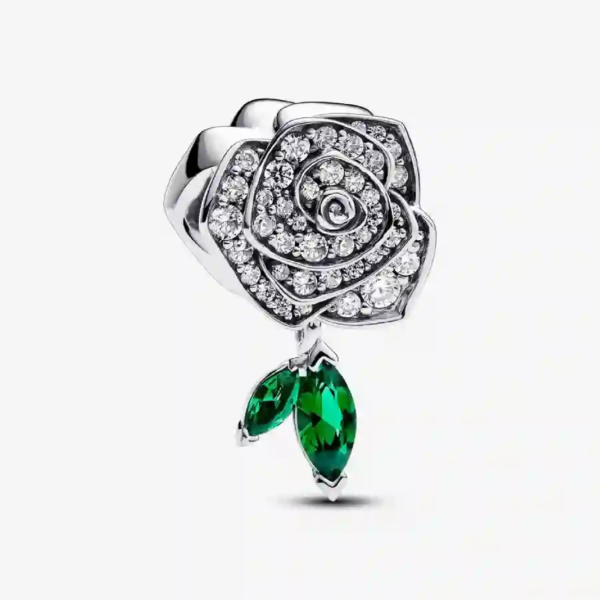 Encarna la elegancia floral de nuestro Charm Sparkling Rose in Bloom, una pieza simbólica elaborada en plata de ley. El dije, con un intrincado diseño para capturar la delicada naturaleza de la flor, presenta un efecto de pétalos en capas para reflejar la belleza de una rosa en flor y está cubierto con pavé brillante. Para dar un aire de movimiento y detalles realistas, dos piedras verdes cuelgan debajo de la flor que representa las hojas. Perfecto como gesto de amor para alguien cercano o como una adición significativa a tu colección, este charm de rosa de Pandora seguramente mantendrá vivo el romance.